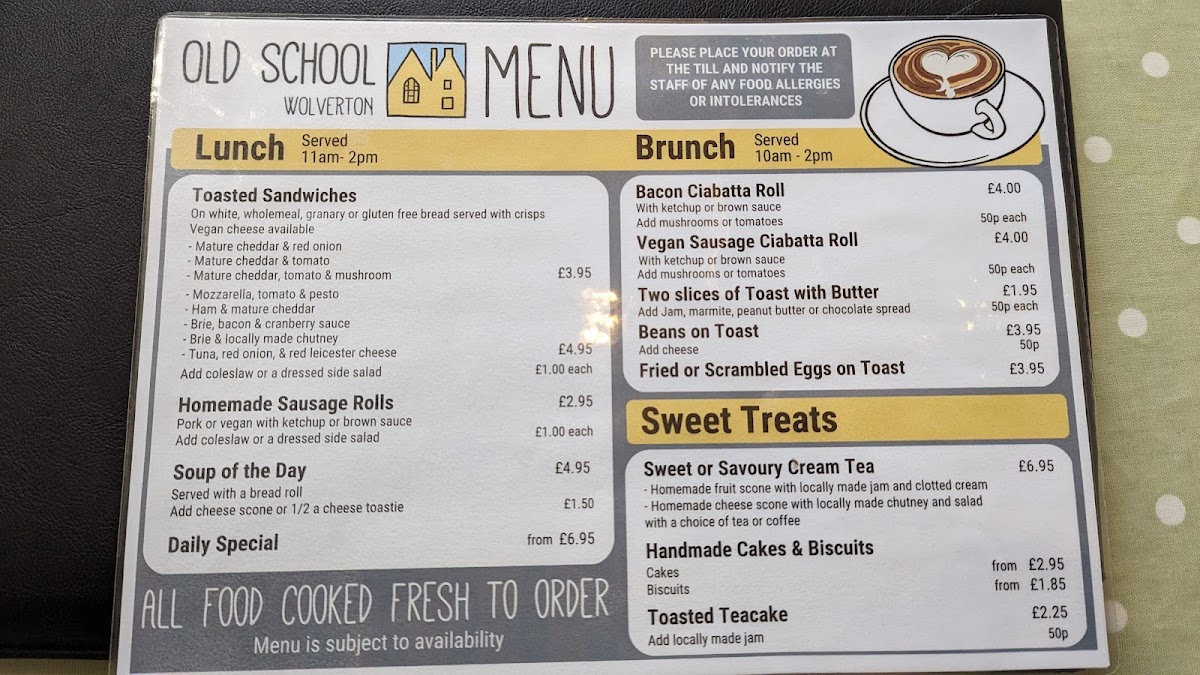 Customer reviews beautifully reflect the essence of The Old School Cafe. Clive Sherwood shares his experience, calling it "a great little find" after a cycling trip, appreciating the charming atmosphere despite the "slow service." Ciaran Taylor praises the friendly staff and fantastic toastie, while Claire Harris raves about the outstanding vegan afternoon tea she experienced, noting that the cheesecakes were "the best food I've ever eaten." The personalized touch from the warm and accommodating staff truly elevates your visit, as highlighted by Helen Bass, who felt genuinely welcomed during her brunch outing.